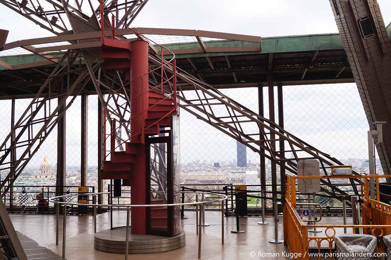Hier sollte noch erwähnt werde, das sich das zweite Stockwerk des Eiffelturms aus zwei Ebenen zusammensetzt, wie man es auf dem obigen Bild sehen kann. Diese beiden Ebenen sind über eine Treppe mit 20 Stufen miteinander verbunden.